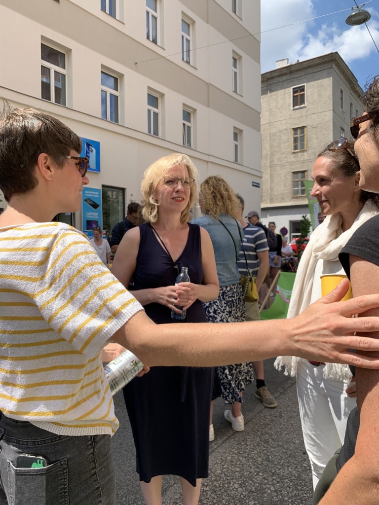 Anwesend waren natürlich Vize-Bezirksvorsteher Bernhard Seitz und unsere ehemalige Bezirksvorsteherin Uschi Lichtenegger, von der die Idee zum „Supergrätzl Volkertviertel“ stammt. Mit uns gefeiert haben aber auch u. a. die Klimaministerin Leonore Gewessler, die Parteivorsitzende der Grünen Wien Judith Pühringer, die Nationalratsabgeordneten Sibylle Hamann und Lukas Hammer, der Verkehrsexperte Ulrich Leth und die Kinderbuchautorin Melanie Laibl.